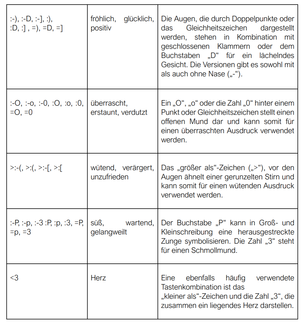 Das Wort „Emoticons“ setzt sich aus dem Wort „Emotions“ und „Icons“ zusammen und beschreibt aufeinanderfolgende Zeichen, die den Tonfall einer Nachricht unterstreichen sollen. Häufig in Form von Smileys und am Ende einer Nachricht ähneln sie sehr den bekannten Emojis, unterscheiden sich aber leicht in Funktion und Anwendung. Die Darstellungsweisen sind mittlerweile beinahe unbegrenzt, aber am häufigsten bekommt man wohl den lächelnden Smiley („:-)“), der mit zwei Punkten, einem Strich und einer Klammer dargestellt wird, zu Gesicht. Dieser wurde als erstes nachzuweisendes Emoticon 1982 von Informatiker Scott Fahlmann in einer E-Mail verwendet, um den Tonfall seiner Nachricht zu verdeutlichen.